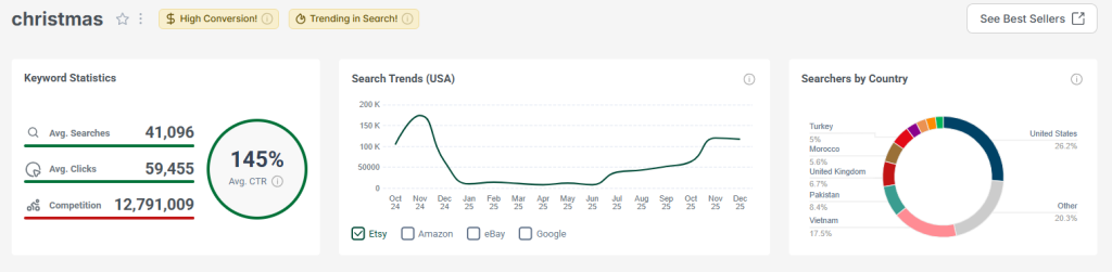 On the top left is the Keyword Statistics, with a breakdown of data averaged over the past 12 months. We see that searches, clicks, and CTR (Click Through Rate) are all quite good. No surprise: competition for Christmas is high. Over on the Search Trend line graph, the green line shows October 2024 through December 2025. It shows reasonably steady search volume for this keyword that climbed to a high in November both years.