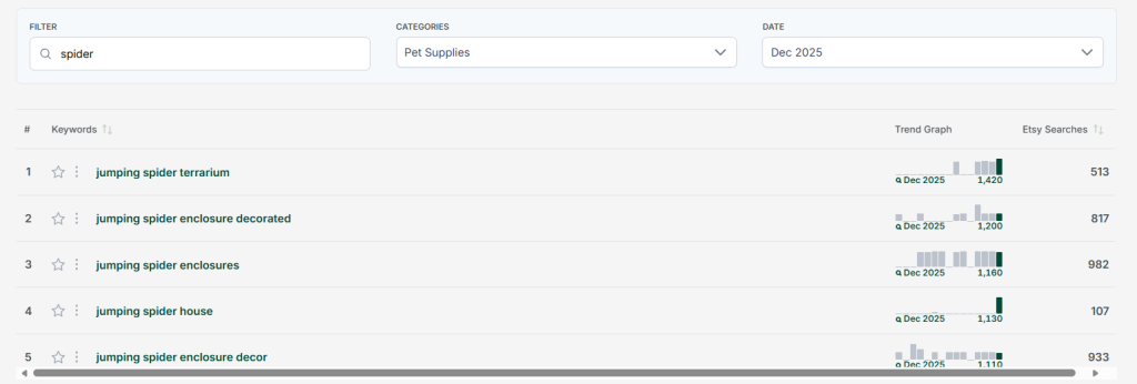 Another reason I scroll through Pet Supplies is to see which animals are popular. Of course I see dog, cat, horse because they are always popular. An interesting find is jumping spider, which pops up multiple times. I can just type spider into the filter to see how many made the Top 100.