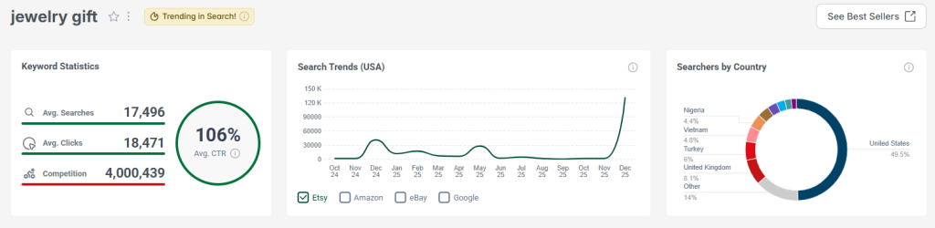 I click on jewelry gift, which takes me to the Keyword Tool and the analysis for “jewelry gift” for the USA on Etsy. Taking a look at the Search Trend graph, we can see that it’s been a viral keyword for over a year. However, it’s very generic, as jewelry gift can describe so many different things. There is also a lot of competition for this term, so it will be very challenging to get into the top search results for it. For these reasons, it may not the best keyword to optimize your SEO on Etsy.