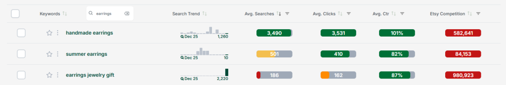 In this case, the keyword “summer earrings” is interesting because it has a medium search volume in relation to the number of competitors (with a fraction of the competition for “handmade earrings”), and it also has a decent click-through rate, meaning buyers click on the listings that they see when performing a search on Etsy.