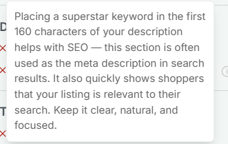 After adding your new superstar keyword, the page will refresh and display where in your listing you are already using this particular keyword. Also, see tips for how you could improve the usage of that keyword within your listing following Etsy’s best practices. Having your superstar keyword in your title, tags, and description can give you more chances to match with buyer searches, resulting in more opportunities to boost your visibility.