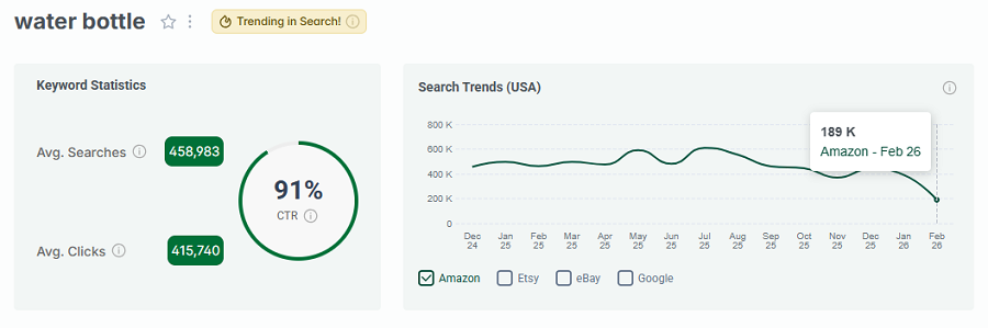 This shopper search is at its 15-mo low and that is still nearly 190K searches! What we like best about “water bottle” though is that it’s a product many of you could sell. Offering them personalized, customized, or hand-painted could give you that competitive edge.
