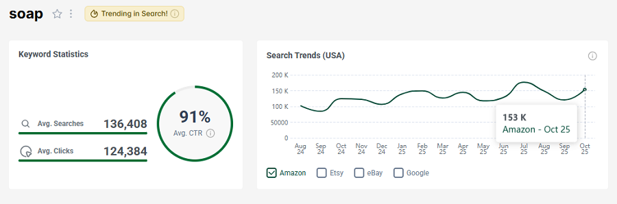 Spectacular CTR! And look at that: “soap” hasn’t dropped below 100,000 searches/mo since September 2024. Notably, “soap” is also up 23% over October last year. And it’s got Keyword Tool’s golden badge; it’s still trending high in search this week.
